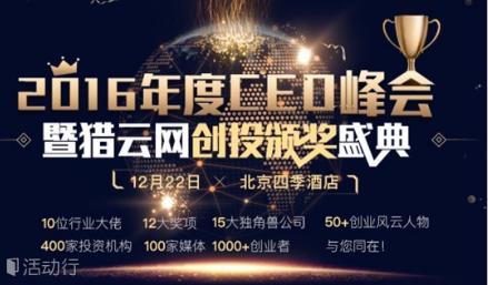 12月22日,北京四季酒店,獵云網(wǎng)將與您相約“2016年度CEO峰會暨獵云網(wǎng)創(chuàng)投頒獎盛典”,見證創(chuàng)投界大咖們的思想洞見,獲取創(chuàng)業(yè)者領(lǐng)軍人物的實(shí)踐真知,分享成功創(chuàng)業(yè)者們的激情喜悅。
